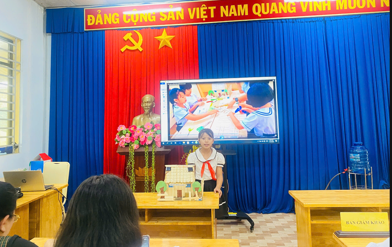 Sau phần trình chiếu, đại diện mỗi tổ đã trực tiếp thuyết trình, giới thiệu chi tiết về sản phẩm dự thi. Nội dung thuyết trình tập trung vào mục đích, ý nghĩa, nguyên lý hoạt động cũng như tính ứng dụng thực tiễn của sản phẩm. Các em học sinh thể hiện sự tự tin, mạnh dạn và khả năng diễn đạt rõ ràng, mạch lạc trước Ban giám khảo.