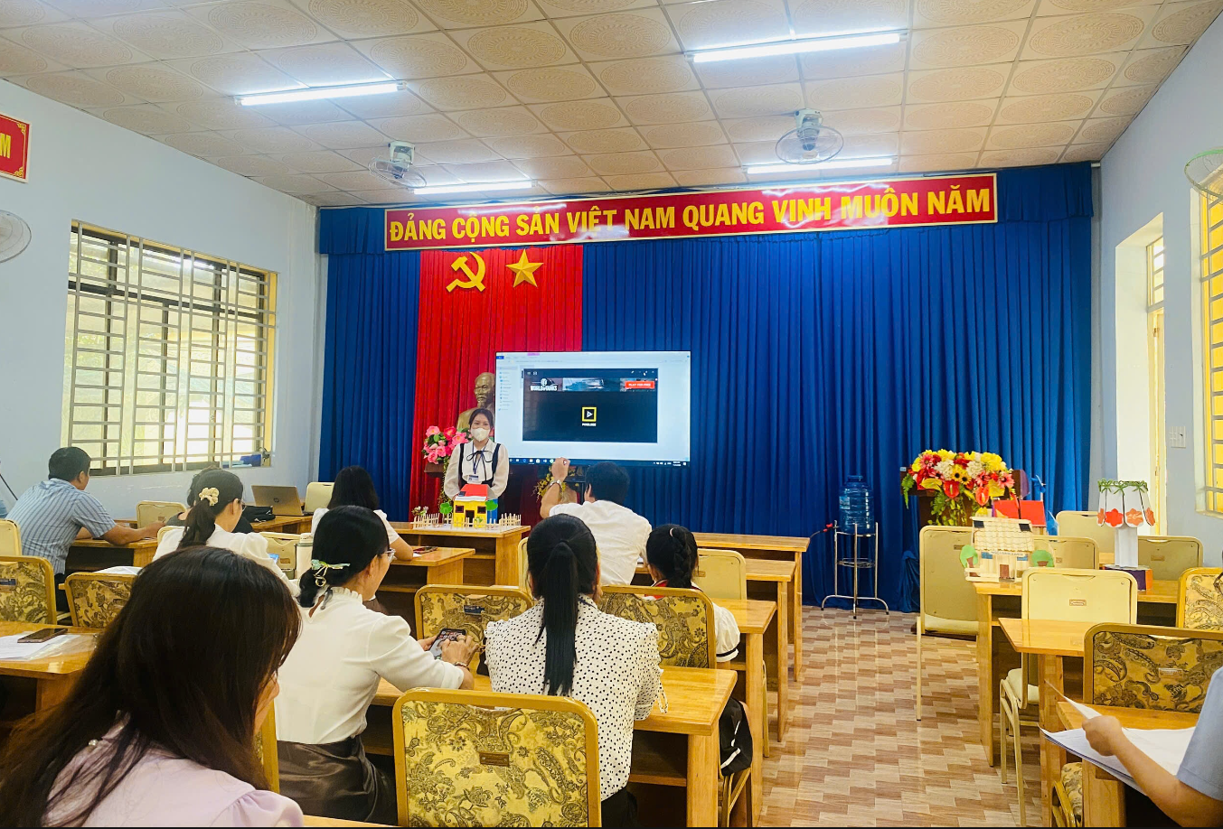 Trong phần thi quan trọng của chương trình, lần lượt 5 tổ chuyên môn đã tham gia trình chiếu video giới thiệu quá trình hình thành ý tưởng, thiết kế và hoàn thiện sản phẩm STEM của mình. Các video được chuẩn bị công phu, thể hiện rõ sự đầu tư nghiêm túc từ khâu lên ý tưởng đến quá trình thực hiện.