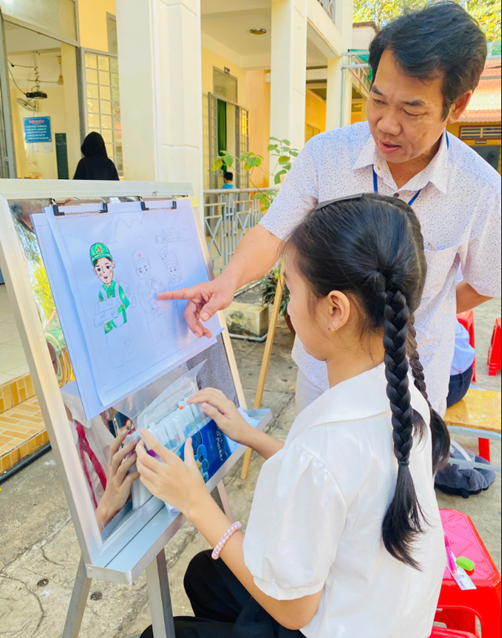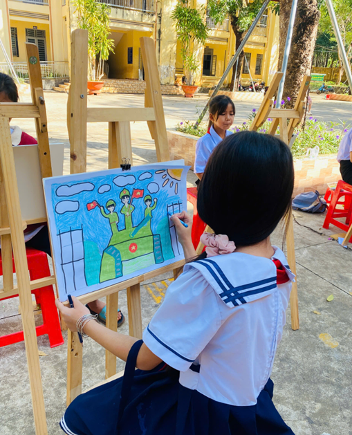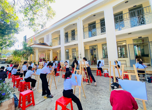 Ngay từ sáng sớm, sân trường đã ngập tràn sắc màu của giá vẽ, giấy vẽ, bút màu và những gương mặt háo hức của các em học sinh tạo nên một không gian nghệ thuật sinh động, đầy cảm xúc và ý nghĩa giáo dục sâu sắc.