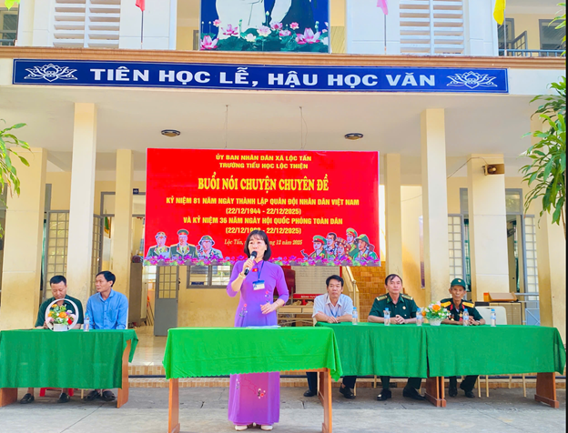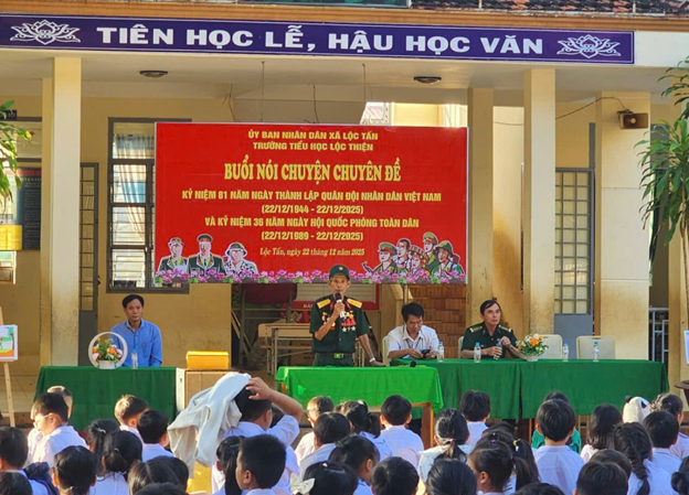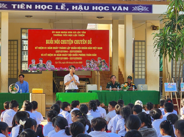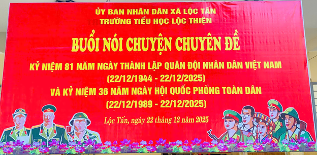 Vào lúc 7 giờ 15 phút, Sáng thứ Hai, ngày 22/12/2025. Trong buổi sinh hoạt dưới cờ tại Trường Tiểu học Lộc Thiện đã phối hợp với Hội Cựu chiến binh xã tổ chức buổi nói chuyện truyền thống với học sinh, nhân dịp kỷ niệm 81 năm Ngày thành lập Quân đội nhân dân Việt Nam. Hoạt động diễn ra trong không khí trang trọng, ấm áp, mang ý nghĩa giáo dục sâu sắc đối với các em học sinh toàn trường.